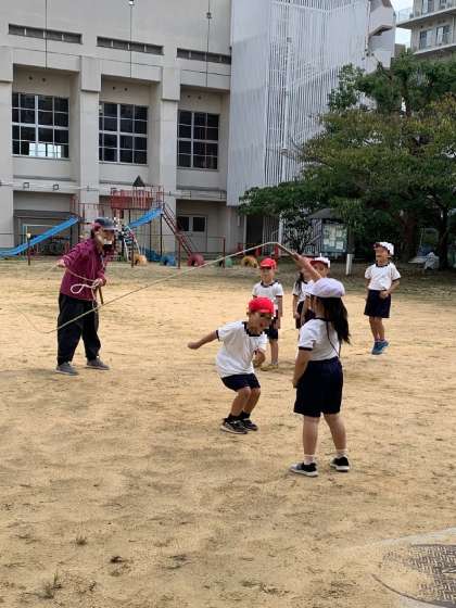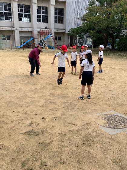 運動場でおおなわです。リズムにあわせてとんでいます。