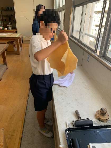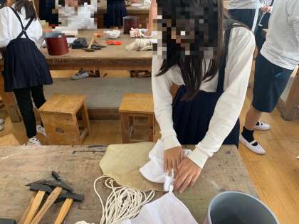 太鼓づくり2 次に皮の作業です。皮の水気をふき取ります。