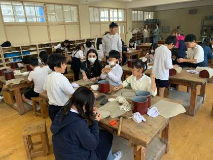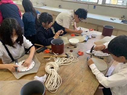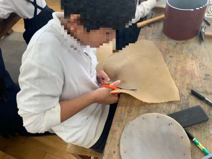 はさみで丸く切り取り、ポンチでひもを通す穴をあけていきます。