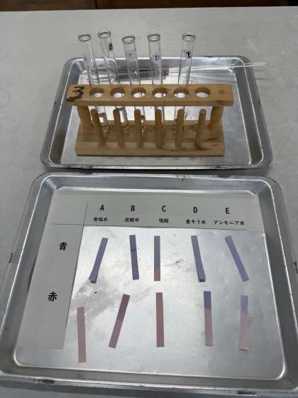 結果から、5つの水よう液を青→赤は酸性、赤→青はアルカリ性、その他は中性と分けることができました。