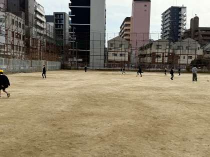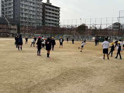 グラウンドでは、子どもたちがドッジボールやサッカーをして、元気に遊んでいます。