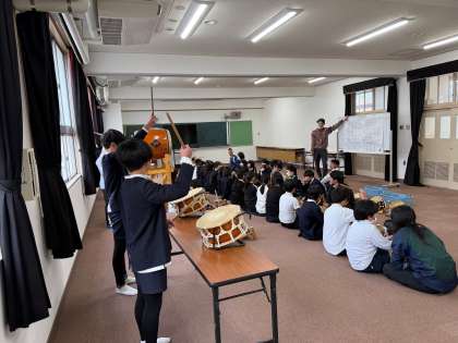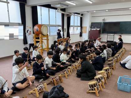 5年生が、学習参観で演奏する太鼓の練習が始まりました。昨年度発表した6年生が5年生に教えています。