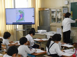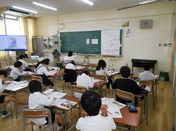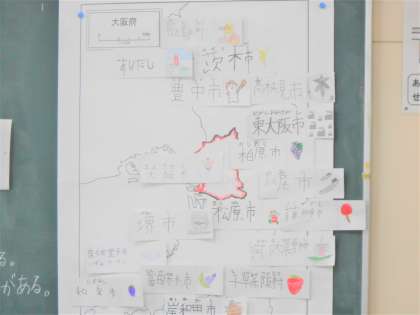 今、4年生は自分たちが住んでいる大阪府について社会科で学習をしています。府内の各地のことを調べて発表し、それが地図ではどのあたりなのかを調べて貼っていきます。地図には子どもたちが書いたカードがたくさん貼られていました。