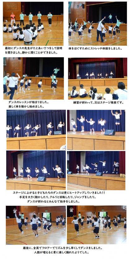 1,2年生が、楽しくダンスの学習をしました。NPO法人カルティベイト所属のダンサーさんたちが教えてくださいました。最初、子どもたちは少し様子を見ていたのか、動きや表情が硬かったのですが、体を動かすうちにどんどんと動きが大きく速くなり、表情が明るくなっていきました。子どもたちそれぞれがその子らしい動きで、体全体を使って踊っていました。