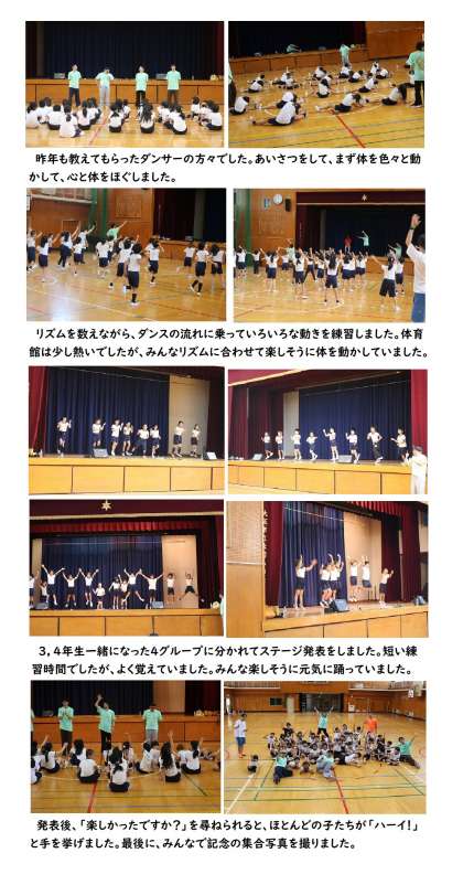 NPO法人カルティベイト所属のダンサーさんたちが3回目のダンス出前授業を3,4年生にしてくださいました。昨年度も来てくださった方々だったので、名前や顔を憶えている子たちがたくさんいました。子どもたちは楽しそうに練習し、ステージ発表にも挑戦しました。リズムに乗って体を思いっきり動かす心地よさを感じているようでした。