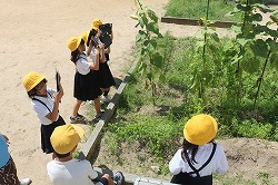 3年生が理科学習で、花は咲いた後どうなっていくのかを学習しました。まず、教室で、花の変化を予想して話し合いました。その後、校庭のヒマワリを観察して学習するのですが、校庭は気温が高いのでヒマワリを学習用端末で撮影し、教室でその画像を見て観察しました。端末に映る画像は、拡大したり、明るくしたりできるので観察しやすいでした。最後に、観察したことをプリントにまとめました。