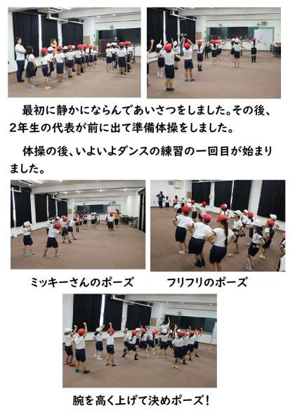 10月25日は運動会の予定になっています。今週から運動会の練習が始まりました。子どもたちは、団体演技、団体競技、1〜4年生は個人走、5,6年生はリレーのそれぞれ一人3種目の競技演技に挑戦します。写真は1,2年生の練習の様子です。1,2年生は、団体演技の練習から始めました。ダンスの曲は、「キミに100パーセント」です。1,2年生にピッタリのかわいいポーズがいっぱいのダンスのようでした。他の学年の子たちも練習をスタートしています。練習は、運動会で子どもたちが自分の力を精一杯発揮するために必要です。ご家庭でも、運動会に向けて頑張る子どもたちを励ましてあげてください。