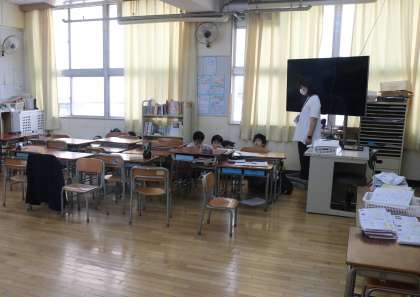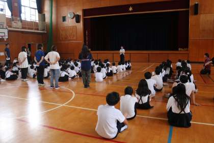 不審者が校舎内に入ってきたという想定で扉などの閉鎖後、教頭先生が緊急放送をしました。放送を聞いた各教室では、入り口を塞ぎ、教室の奥に机を集めその陰に子どもたちが隠れました。不審者が確保、隔離された放送があり、子どもたちは静かに体育館に集合しました。子どもたちも教職員も静かに素早く対応できていました。体育館で、担当の先生、校長先生から話を聞いて対応訓練が終わりました。