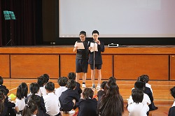 今日の児童集会では、健康委員会の発表と放送・図書委員会からの連絡がありました。健康委員会の発表は、早寝早起きの大切さを考えさせる絵本の読み聞かせと、早寝早起きに関する〇×クイズでした。発表の中では特に睡眠や朝ごはんを食べることの大切さが楽しいお話と挿絵で説明されていました。放送・図書委員会からは、読書の秋なので、大国小学校のみんなが本にもっと親しめるように読み聞かせを昼休みに図書室でするので来てほしいという連絡でした。