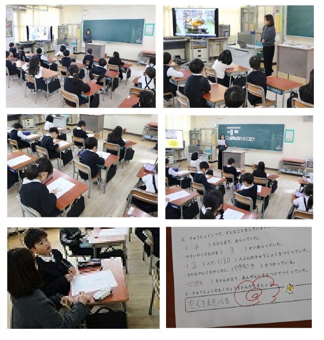 写真は1年生の授業の様子です。給食を作ってくださっている調理員さんは、調理前に手から肘まで丁寧に洗っていることや野菜や果物は3回洗っていること、大国小学校の場合は2人で約130人分の給食を作っていることなどを映像を見せながらわかりやすく話してくださいました。