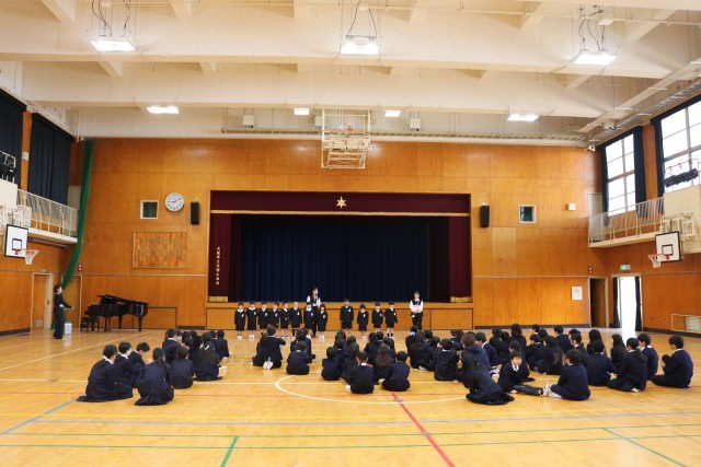 続いて、1年生との対面式を行いました。少し緊張した様子の1年生でしたが、在校生の拍手に笑顔で入場し、全校児童の前で元気にあいさつをすることができました。