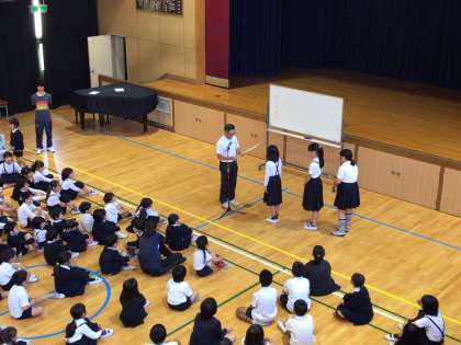 本日の児童朝会は、先日11日(土)に行われたわんぱくずもうの表彰から始まりました。
