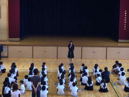 本日の児童朝会での講話は、校長先生が修学旅行の付き添いのため、教頭先生がお話ししました。