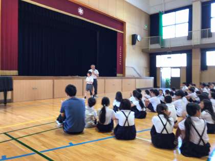 本日の児童朝会では、中華学校からの体験入学生の紹介から始まりました。