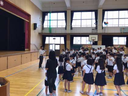 校長先生のお話の後は、1学期を振り返って、各学年の代表児童がみんなの前でスピーチをしました。1年生から6年生まで、よく通る声でしっかりと発表できました。