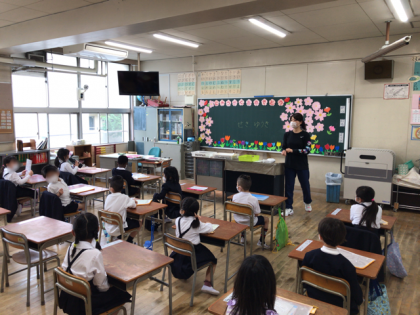 1年生は、初めての教室で担任の先生の話しを静かに聞くことができました。