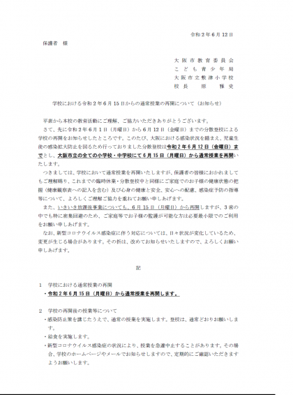 6月15日からの通常授業の再開について(お知らせ)