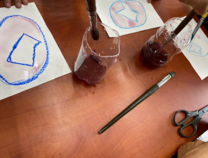 1学期から育ててきた朝顔の花を摘み、それを絞って色水をつくり、こどもたちが描いた朝顔の絵に、色を塗っていました。絵具とちがって、本当に淡い自然な色合いを子どもたちは楽しんでいました。