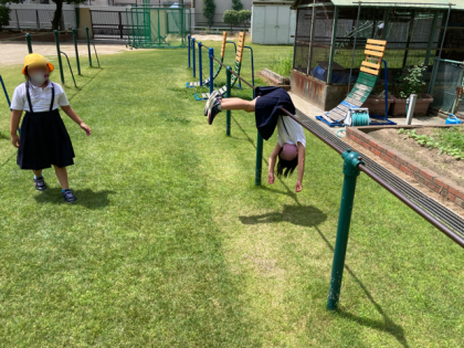 運動場へ行くと、1年生の児童が鉄棒で「洗濯物」をしてくれました。