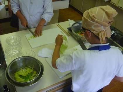 指導を受けながら、時間通り野菜を湯がき、丁寧に包丁を使って刻みました。包丁を使う時は、みんないつにも増して真剣な表情でした。