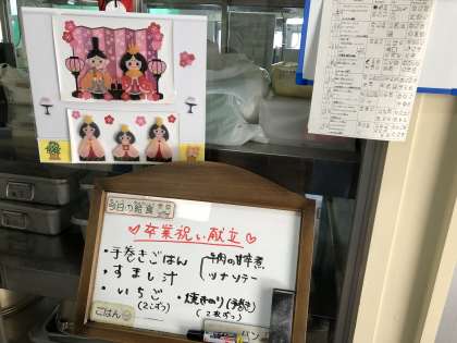給食調理員さんが飾り立てもしてくださり、いつもより豪華です。