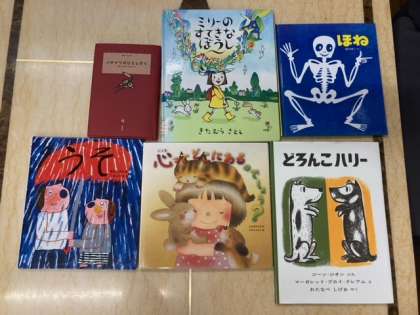 朝読書の時間に、毎月1回浪速図書館のボランティアさんのご協力により全学年の教室で読み聞かせをしていただいています。今日読んでいただいたのはこれらの本でした。