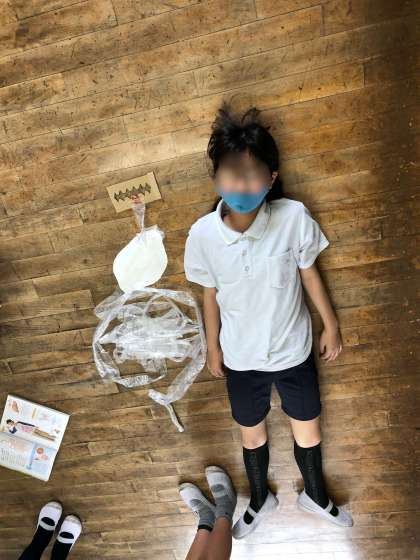 消化管の実物大モデルを使って、口から入った食べ物の行方を学習しました。