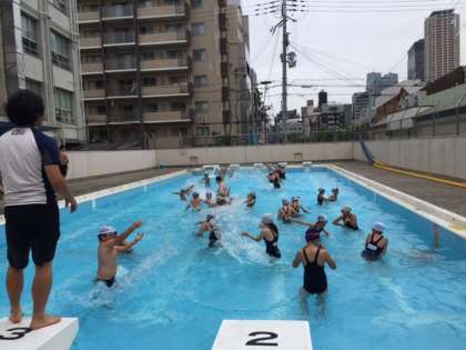 冷たい水に歓声(悲鳴?)を上げながらも、すぐに水に慣れてきた様子で、水中の感触を思い出しながら、さっそく、クロールを何本も泳いでいました。