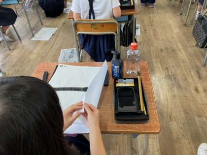 2枚目:4時間目3年生は書写。心おちつかせて真っ白な半紙に向かいます。
