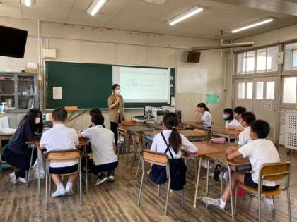 5年生はSDGsについて学習しています。6時間目はGUの方からお話を聞き、着なくなった服のゆくえや私たちができることについて考えました