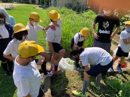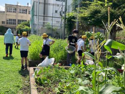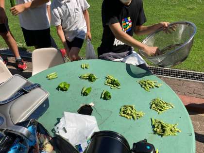 今日は「フレッシュキッズ(畑プロジェクト)」収穫の日。枝豆・オクラ・きゅうり…。
