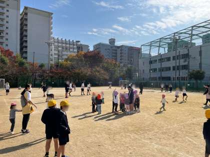 お散歩日和の季節になったため、ひさしぶりにグローバルキッズの園児たちが、敷津小学校の運動場に来てくれました。