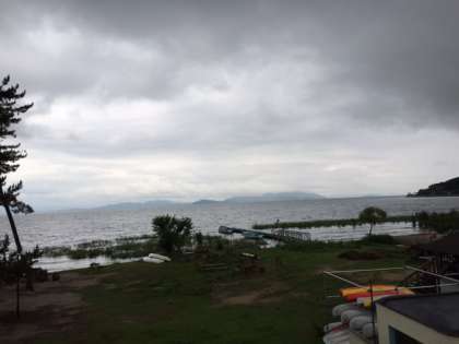 自然体験学習2日目、天気は雨模様……。いつもは野外でする朝の集いを、室内で行いました。