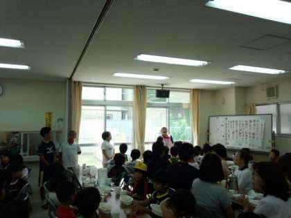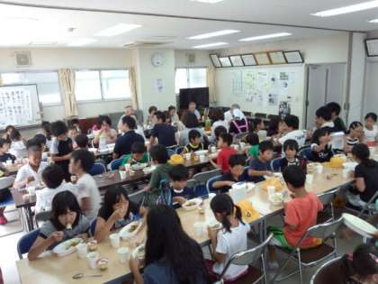 子どもたちが一緒にカレーを食べながら交流する「ふれあい」食事会です