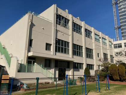 講堂棟の足場がすっかり取れ、きれいな塗装がみえました。防水工事はまだ続きます。