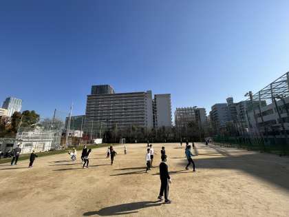 気持ちいい青空の下、きまりがあるわけでもなく、思い思いに誘い合って、他学年、教職員入り混じってドッジボールが始まりました。