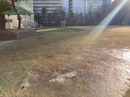 昨日の大寒波の影響で、今朝の校庭には薄氷が張っています。