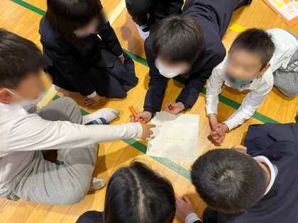 マス目に、グループで相談した敷津小学校の先生の名前を書き入れ、集会委員が言った先生の名前が入っていれば、ビンゴのようにチェックしていくというゲームです。