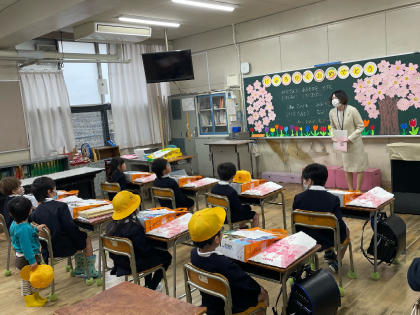 教室で担任の先生のお話を聞きました。