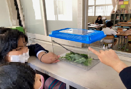 廊下には葉っぱの入ったケース。校庭でみつけて、もうすぐ蝶になると教えてくれました。