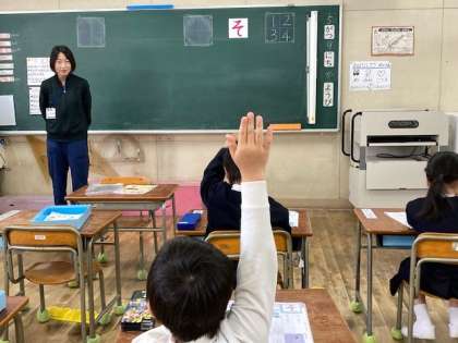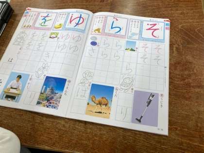 1年生教室。ひらかなを習い始めています。「そ」のつくものは?