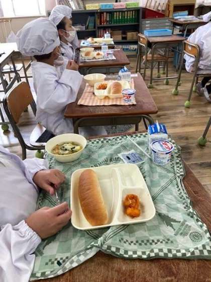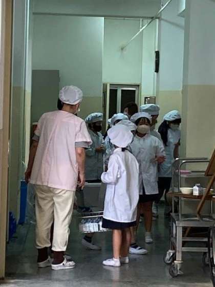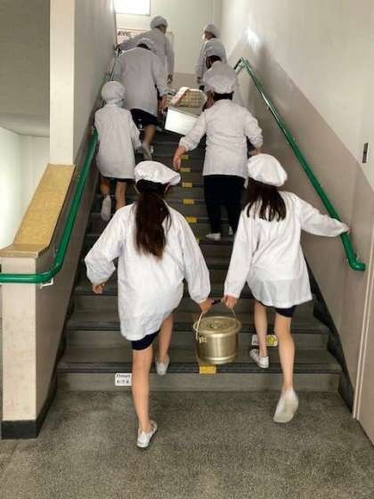 給食準備風景。みんなで力を合わせて。さすが高学年はてきぱきしています。