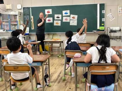 C−netのステフェン先生が教室にきました。楽しいゲームに大興奮。思い切り外国語に親しみました。