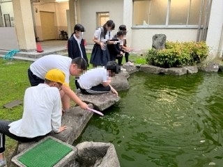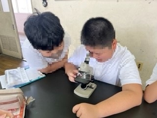 顕微鏡を使って、水中の小さな生物を観察しています。