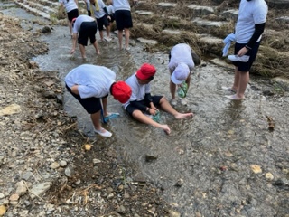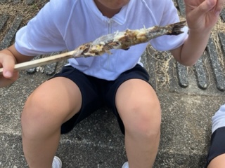 とった魚を食べています。食べた人は、また川遊びを楽しんでいます。