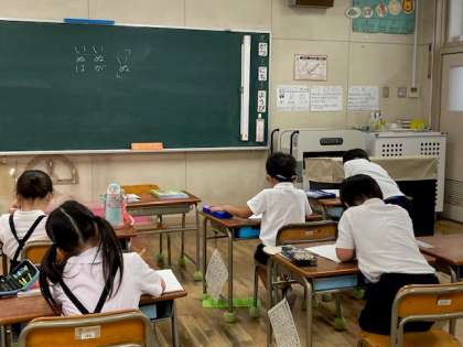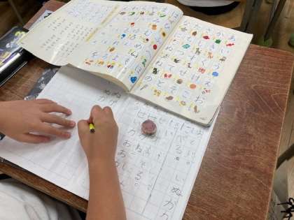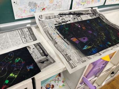 袋の中から引いたカード「いぬ」をつかって文章をつくります。時間内に、たくさんつくれるかな?教室の後ろには図画工作の時間のスクラッチの作品が。