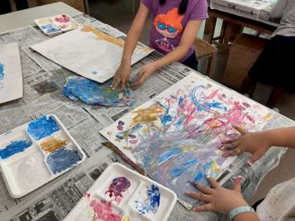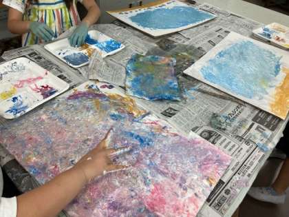 図工室ではBGMが流れる中、自分なりの「海」を制作中でした。もくもくと手のひらで描く姿はさながら小さなアーティスト!でした。