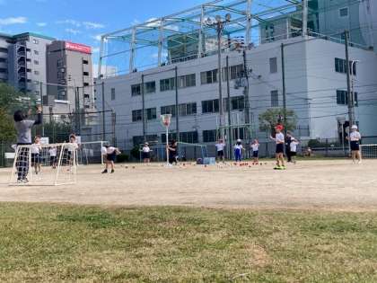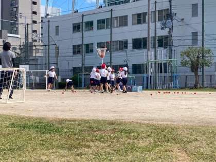 運動会の練習です。音楽がやんだらダンスをやめて急いで玉入れ!