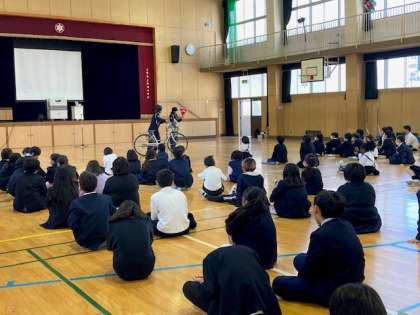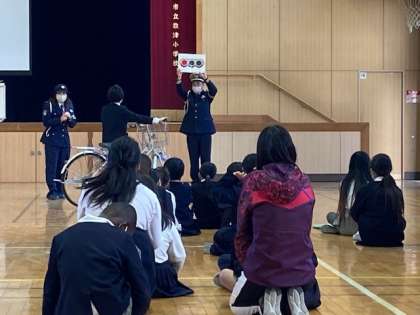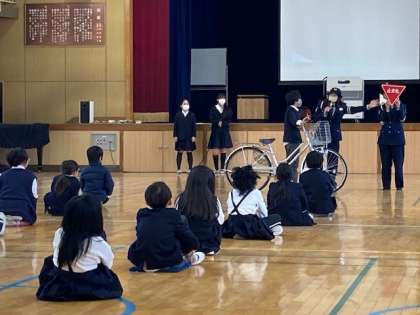 3時間目、浪速警察交通課の方から、交通事故にあわないための自転車の乗り方や交差点での注意を聞きました。「止まる みる 待つ」を忘れないようにしましょう。