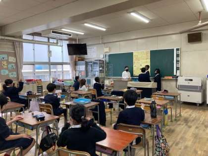 5時間目、グループごとに調べて作った新聞を発表しています。最後にみんなからの質問に答えていました。